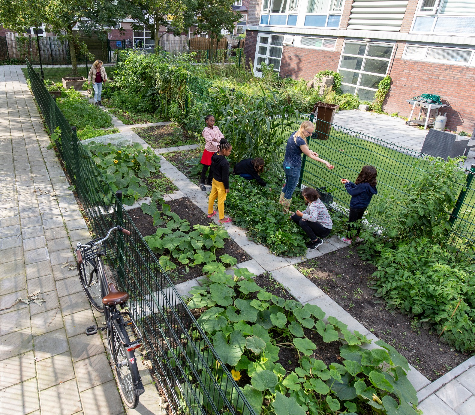 Het kernteam bestaat uit 5 gezinnen. Inmiddels zijn er al 12 vrijwilligers – vaak hele gezinnen – bijgekomen. "De tuin is een ontmoetingsplaats geworden voor de buurt. Vooral in de middag komen veel kinderen helpen. Alles wat rijp is, mogen ze plukken en meenemen naar huis." Karin Buitenkamp, ook lid van het kernteam, is net bij Abdellah geweest en heeft goed nieuws. Ze wijst naar een grasveld iets verderop: "Ik heb net gehoord dat we subsidie krijgen om daar ook een moestuin van te maken!"